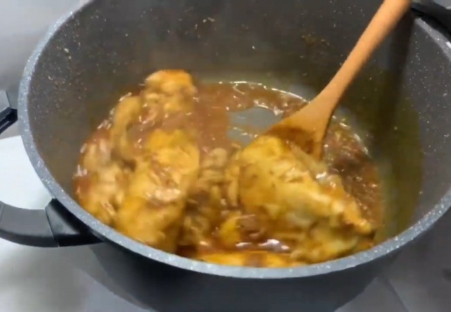02 Pour 1 cup oil into a cooking pot, drop in the chicken, and add 2 tbsp garlic paste. Cook for a few minutes.