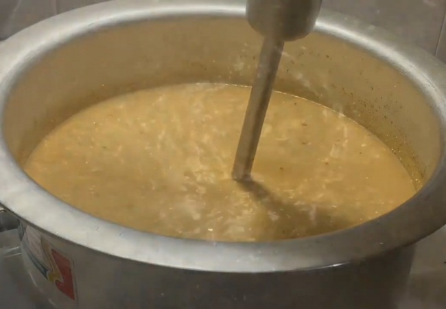 09 Add 3 liters of water and add 1tbsp ground black pepper and 1 tbsp chill flakes. Cover the pot and leave it for 2 hours. Make sure to give it a mix every once in a while. In the meanwhile, cut the previously cooked boneless chicken into small pieces and put it inside the pot. Use a blender to properly mix in all the ingredients