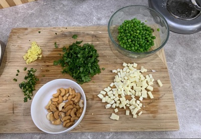 2. Add 1-inch ginger, 1/4 cup of cashew nuts, 2 green chillies, 1/4 cup cilantro, 1/2 cup of boiled peas. 1/2 cup of Paneer.