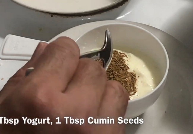 03Now add 1 tbsp salt and white pepper. Add the cumin seeds into the yogurt in a separate bowl and mix well.