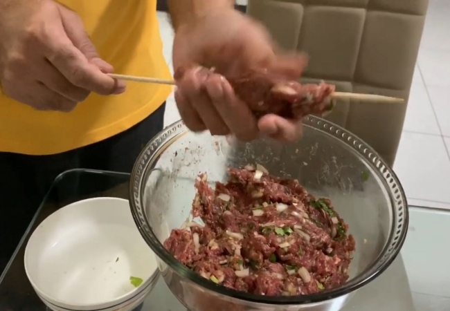 03After marination, take some hot water in a bowl, grab some marinated mince and give them a kebab shape with a help of a wooden stick (shaped like chopsticks). Hot water can be used to soften the meat for better shaping.