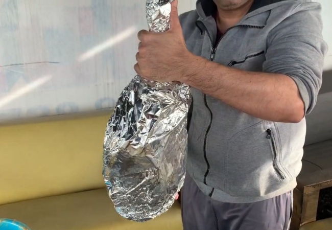 03 Marinate for 1-2 hours. Properly wrap the meat in aluminium foil and make sure to leave no open spaces.